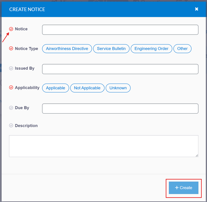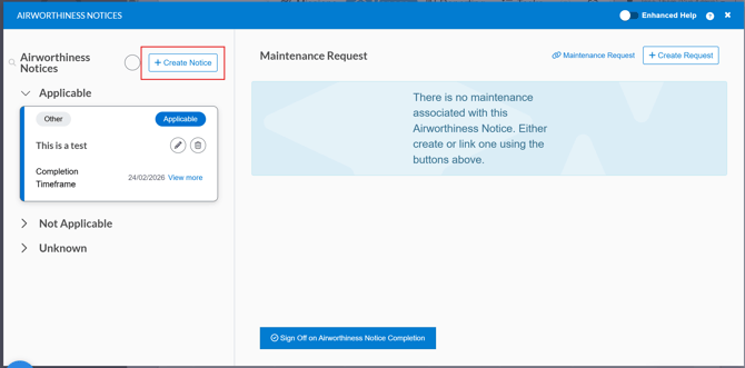 - Click + Create Notice to create an Airworthiness Notice