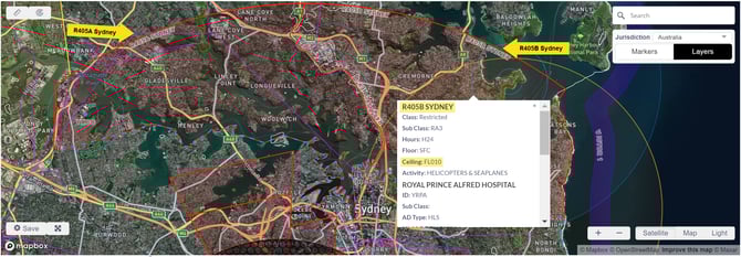 These areas are marked on the map with a red border and text: 'R405A SYDNEY' and 'R405B SYDNEY'. Click in the area to see the height restrictions, the example below shows the information for R405B Sydney.