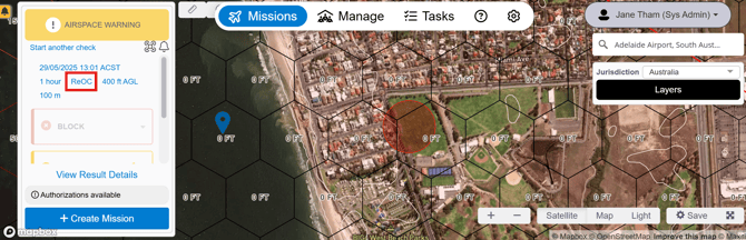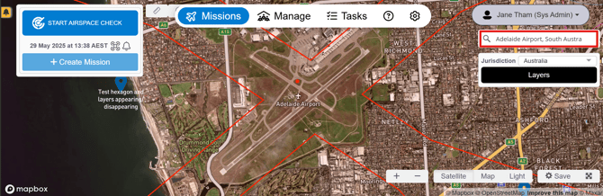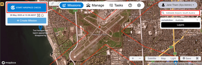 If you want to check the airspace before committing to creating a mission, you can do so by starting an airspace check on the map from the Missions dashboard.