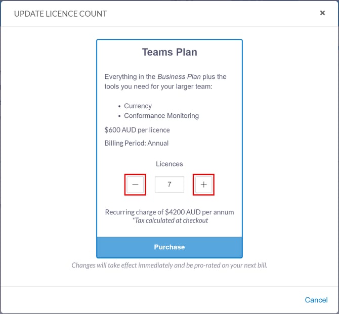 4. Update your licence count by clicking the add or subtract icon, then click Purchase.
