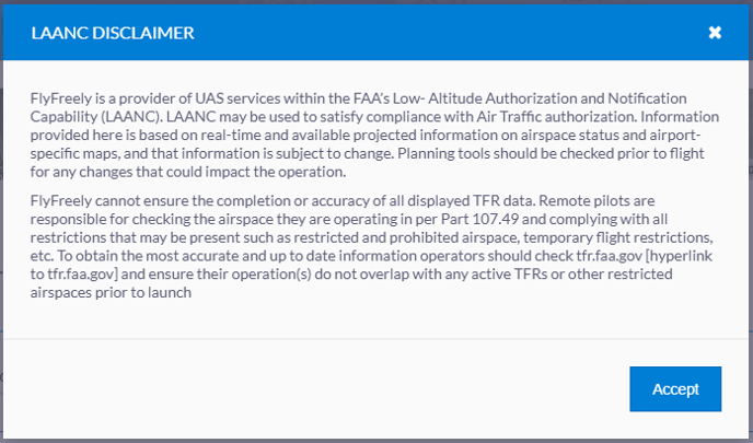 Click on 'Plan a LAANC Authorisation' and a pop up window will appear with a disclaimer to accept. Please ensure you read this disclaimer carefully and understand what you are accepting before you proceed.