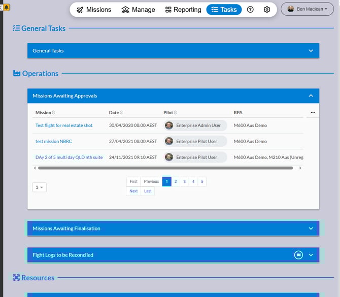 These tasks relate to upcoming and recent missions. Depending on the user's role/s, tasks can include: