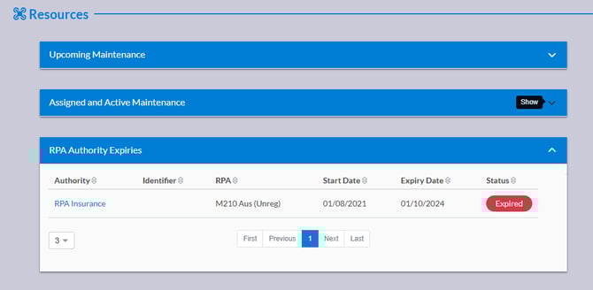 This category includes equipment maintenance activities and RPA-related authorities (for example, expiring insurance certificates or regulator registrations) and is generally relevant for organisation administrators and maintenance controllers.