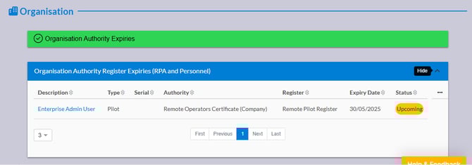 Expiries are listed by authority. In the below example, the pilot named "Enterprise Admin User" will soon expire from the ReOC certificate pilot register. The green bar at the top indicates that the organisation authorities themselves (eg, the ReOC) are ok and are not expiring within the next 30 days.