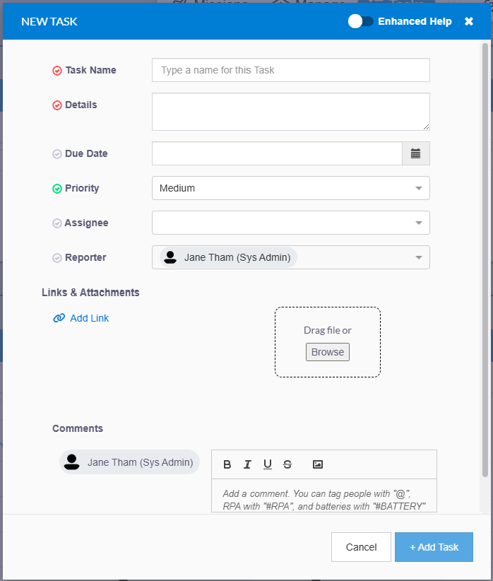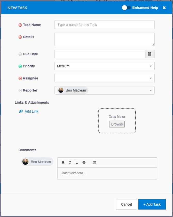 Simply fill in the above fields and click "+ Add Task" to create your task. It will then be assigned to the relevant user and will appear in their tasks view.